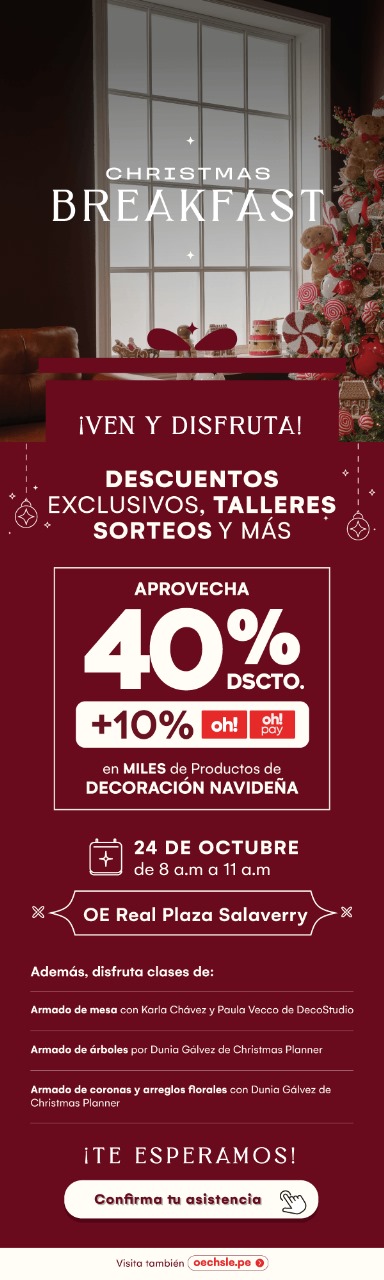 ¡Ven y disfruta de descuentos exclusivos, talleres, sorteos y más! Aprovecha 40% de descuento +10% en miles de productos de decoración navideña. Evento el 24 de octubre de 8 a.m. a 11 a.m. en OE Real Plaza Salaverry. Además, disfruta clases de armado de mesa, armado de árboles y armado de coronas y arreglos florales. ¡Te esperamos! Confirmá tu asistencia. Compartido por Simón 😉👍🏻Tienda: oechsle