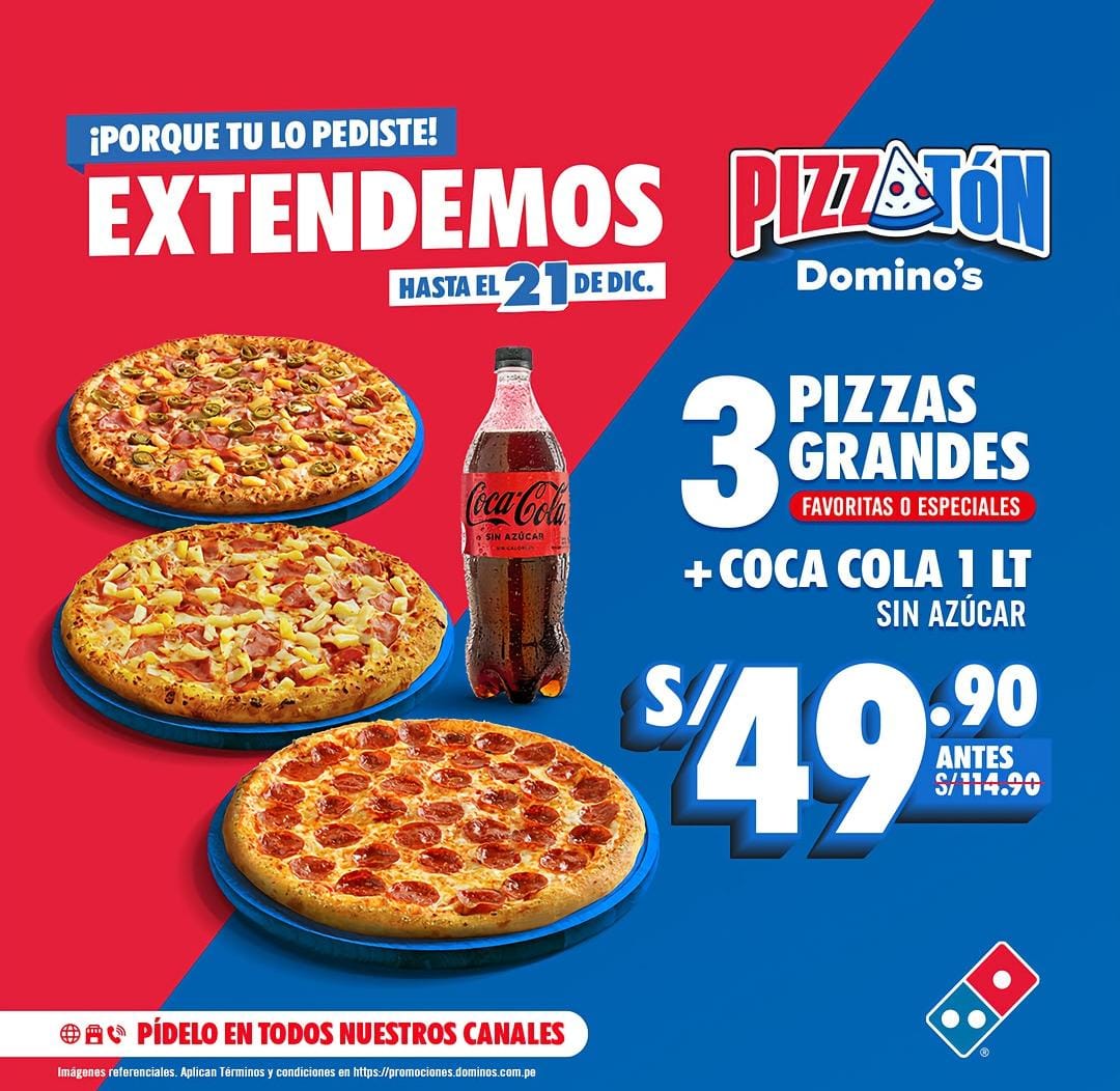 Hasta el 21 de diciembre, disfruta de 3 pizzas grandes (favoritas o especiales) + una Coca Cola 1L sin azúcar por solo S/49.90. Compartido por Luis Castro @royrocer.Tienda: domino’s