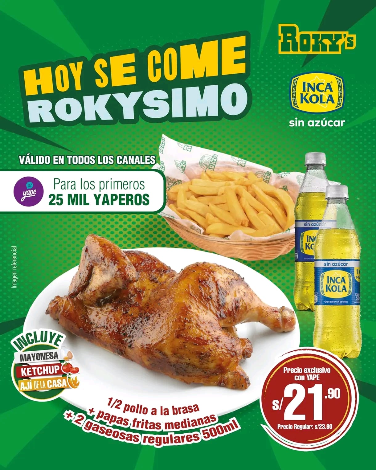 Incluye: 1/2 pollo a la brasa + papas fritas medianas + 2 gaseosas regulares 500ml. Precio exclusivo con Yape: S/ 21.90 (Precio Regular: S/ 23.90). Válido en todos los canales. Para los primeros 25 mil yaperos. Compartido por: Ivan-ATienda: roky’s