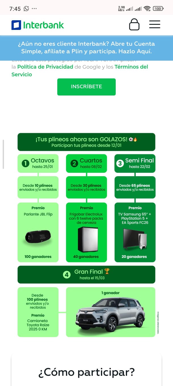 ¡Tus plineos ahora son GOLAZOS! Participan desde el 12 de enero hasta el 15 de marzo. Hay varios premios increíbles para los ganadores. Para los octavos (hasta el 25/01), el premio es un Parlante JBL Flip. Para los cuartos (hasta el 08/02), puedes ganar un Frigobar Electrolux con cervezas. En la semifinal (hasta el 22/02), el premio es un TV Samsung y una PlayStation 5. ¡Y en la gran final, puedes ganar una camioneta Toyota Raize 2025!