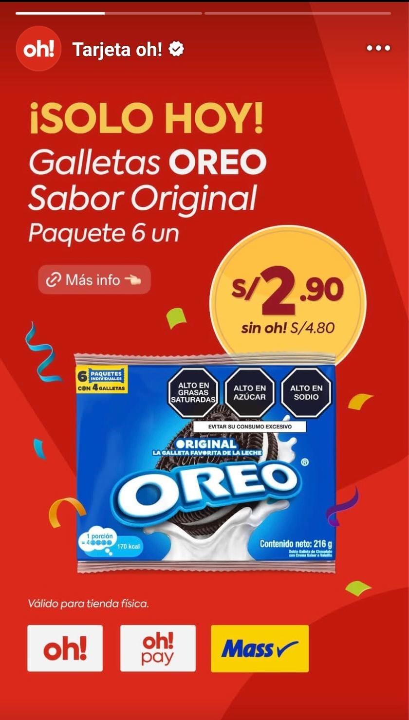 Aprovecha esta oferta exclusiva: Galletas OREO Sabor Original a solo S/2.90 con la tarjeta oh! (precio sin tarjeta S/4.80). ¡No dejes pasar esta oportunidad! Compartido por Jona.Tienda: oh!